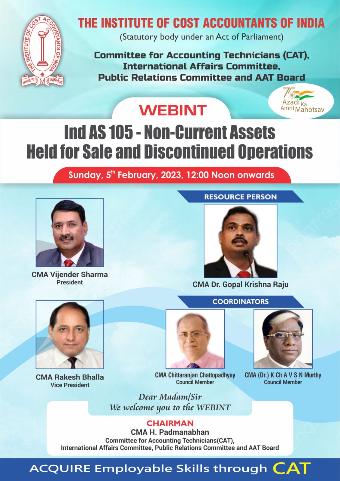 We are pleased to WELCOME you to the WEBINT on the Topic:Ind AS 105 – Non-Current Assets Held for Sale and Discontinued Operations, an initiative by the Committee for Accounting Technicians(CAT), International Affairs Committee, Public Relations Committee & Association of Accounting Technicians Board of The Institute of Cost Accountants of India on Sunday, 5th February, 2023, from 12:00 Noon.